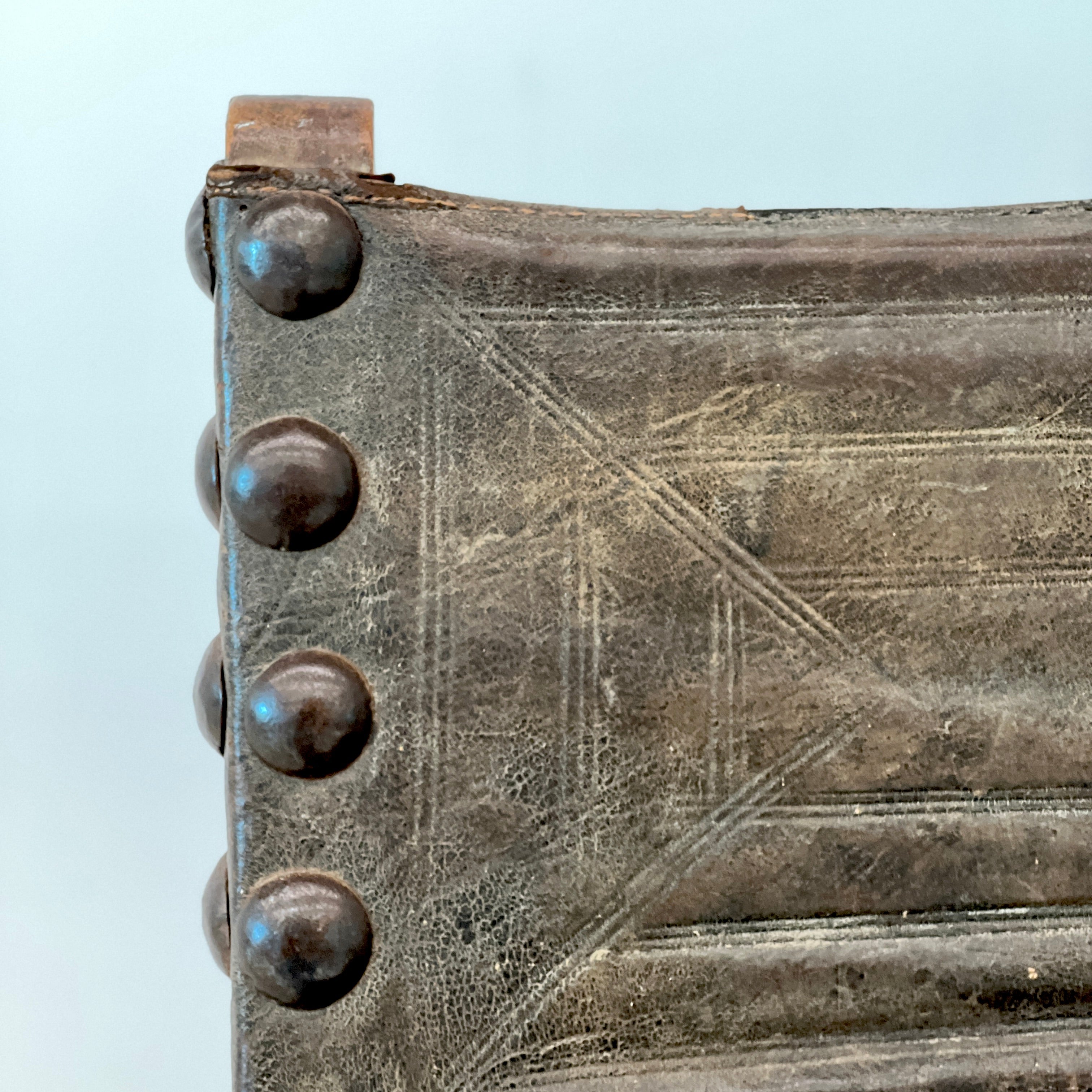 John set the beauty of the worn wood and cracked leather of this chair against the polished surroundings of the guest bathroom, where it held the dignified position of towel butler.